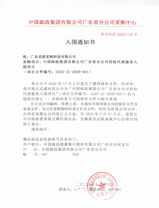 2020年11月4日,中國(guó)郵政集團(tuán)有限公司廣東省分公司開展了“中國(guó)郵政集團(tuán)有限公司廣東省分公司招標(biāo)代理服務(wù)入圍項(xiàng)目” 的遴選工作,廣東采聯(lián)采購(gòu)科技有限公司(以下簡(jiǎn)稱:采聯(lián)科技)成功入圍"中國(guó)郵政集團(tuán)有限公司廣東省分公司招標(biāo)代理服務(wù)入圍項(xiàng)目"。
